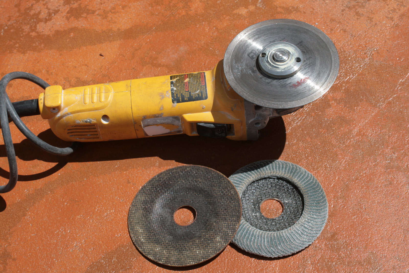 My grinder has the concrete-cutting blade on it in this picture, metal cutting is lower left, sanding wheel is lower right.