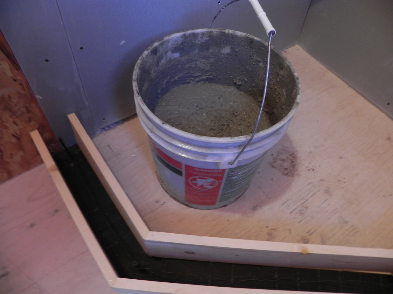 Mix the cement outside in a wheelbarrow one bag at a time, and carry it in to the house in a 5 gallon bucket. Dump it into your future shower, and it will look like this: