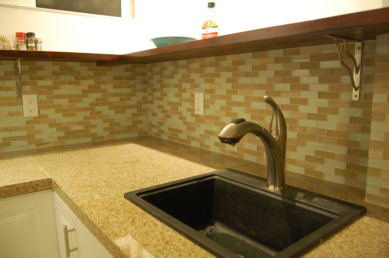 Close-up on the kitchenette details. A single bowl 18″ formed sink saves space. 12×30 granite tiles were cut to form a low-cost granite countertop surface. Nice backsplash tiles. And I built an open shelf (stained dark red) instead of using upper cabinets, to give a cleaner and more open feel to the small area.