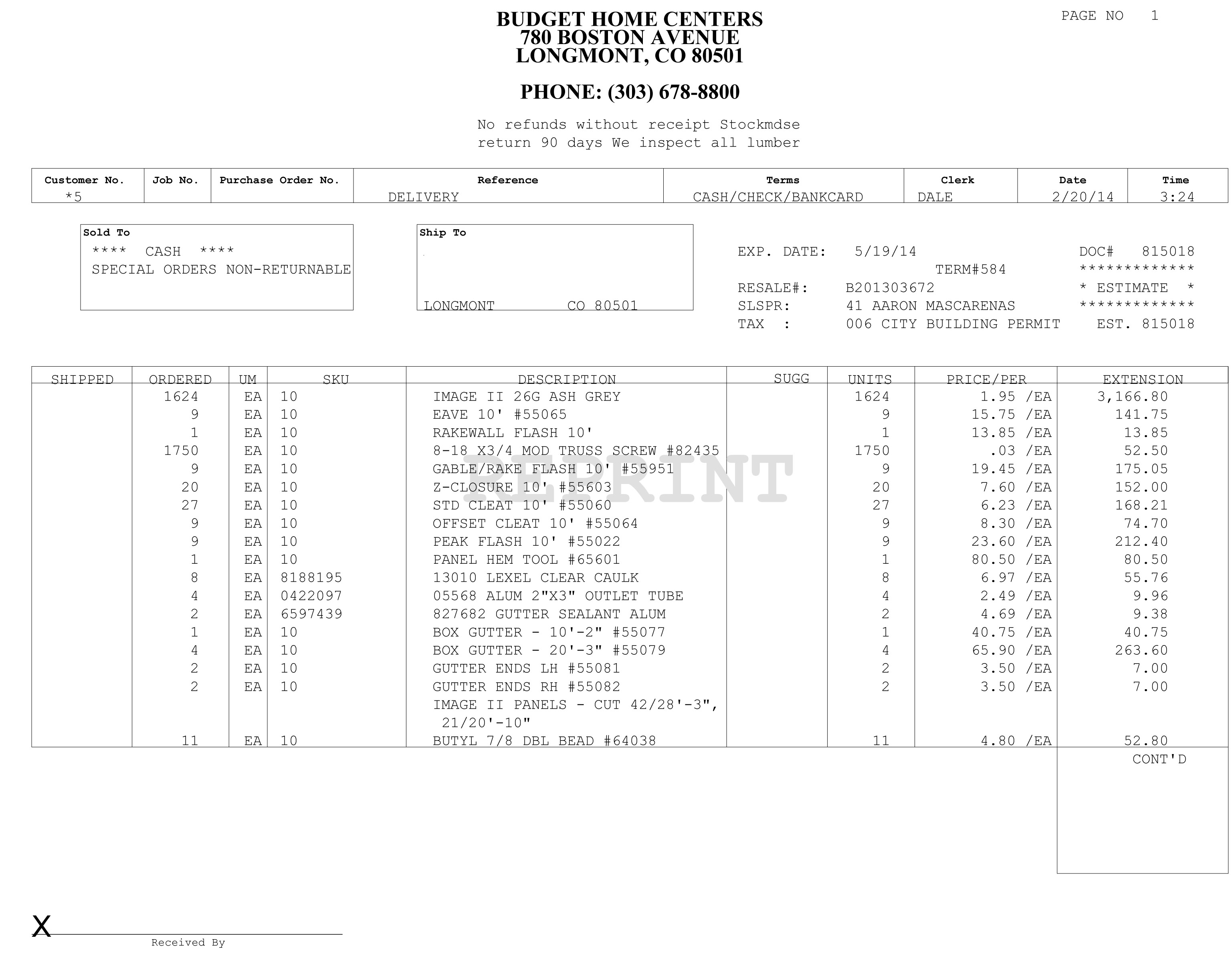 bhc_quote-1I got this quote from a local building supply store called Budget Home Center – they sell MSI stuff at the same price at Home Depot, but the staff is far more knowledgeable and responsive. Even so, I ended up with a few unneeded parts: the “standard cleat” and “eave flashing” are not needed for my job. The total cost, including complimentary delivery right to my front yard, was about $4500 if you avoid ordering the unnecessary stuff. Not bad for a $13,000 roof!