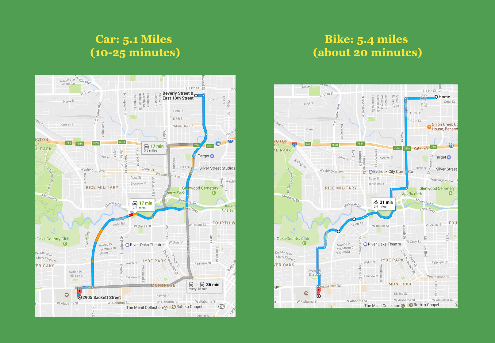 Fig.1: Google Maps view of car vs. bike routes to work. Bikes are surprisingly fast, plus immune to traffic jams and you get free parking.