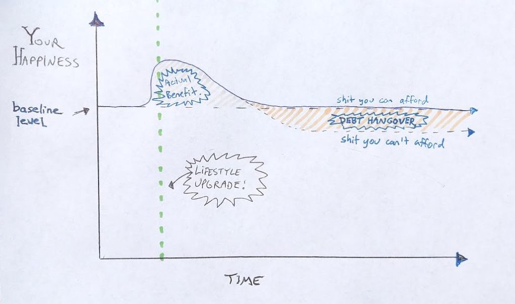 You may recall me cautioning you in this long-ago MMM Classic, to avoid buying yourself fancy shit, because the thrill of every new life upgrade – whether it is a nicer dishwasher or a faster Mercedes – always wears off, and your overall life happiness returns to exactly where it was. It’s quite an un-intuitive result, but if you watch yourself over time, you will notice it is uncannily accurate.