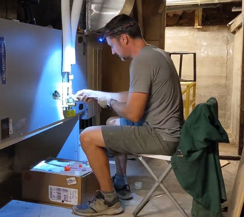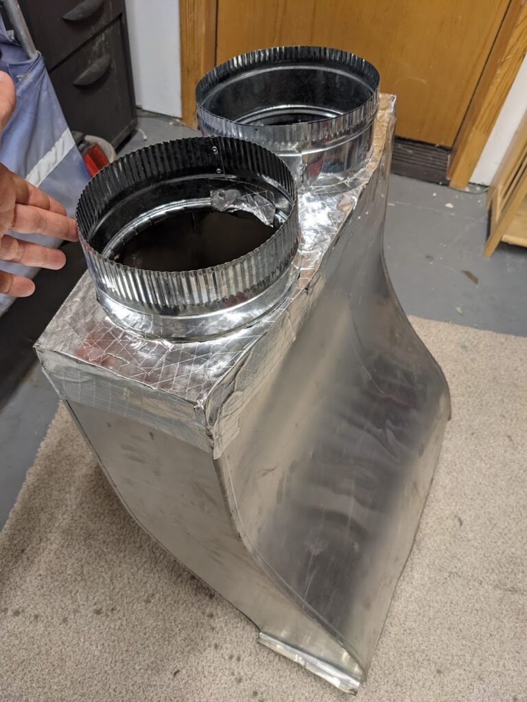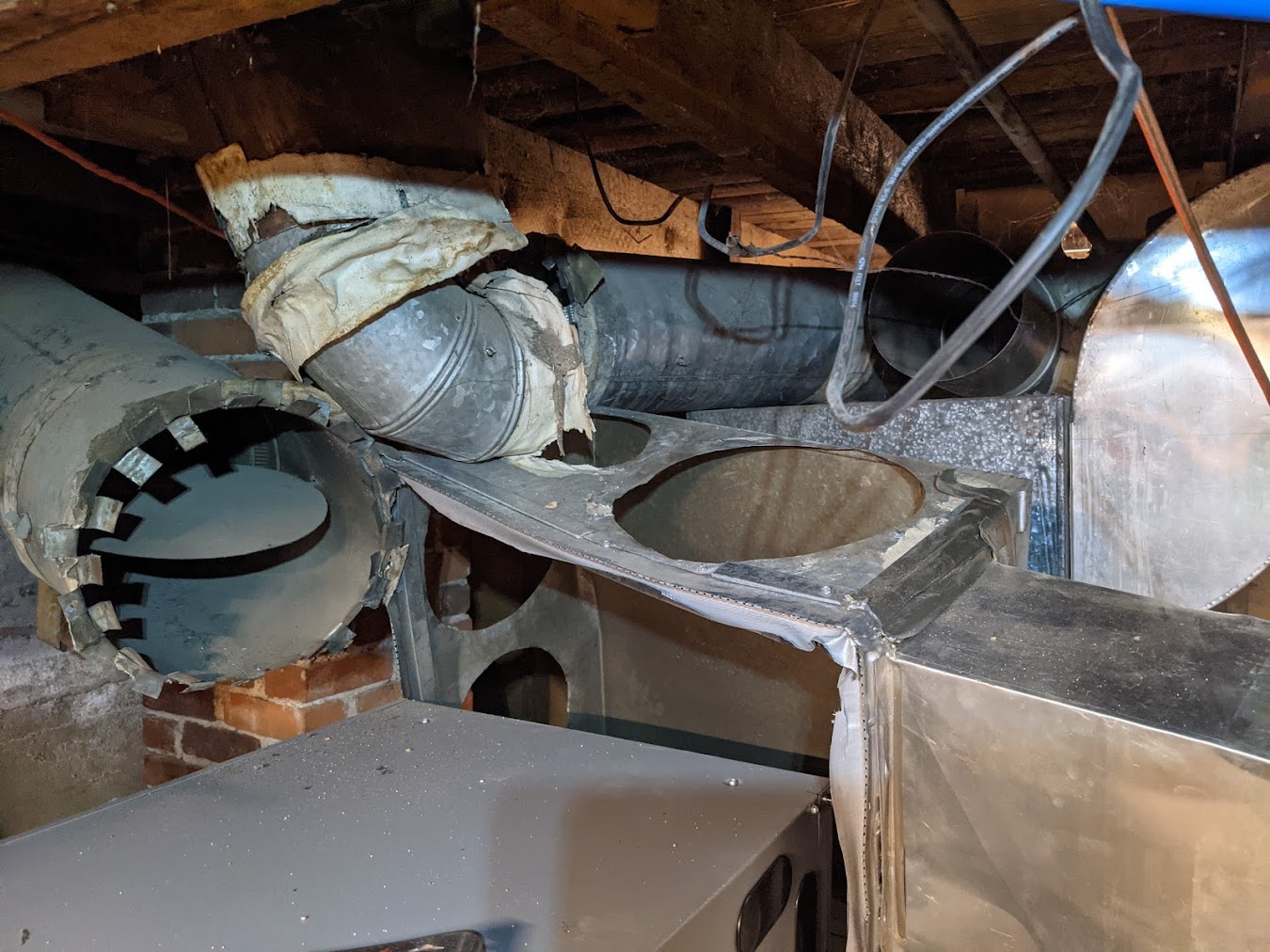 Because our basement ceiling is so low, I had to install the heat pump horizontally (it is designed to allow this), and then build some adapters to allow the air to flow the way I needed. On top of that, most of our ducts were falling apart and poorly shaped and useless – so I repaired or replaced a bunch of them while I was in the process. This took a lot of work, but my biggest allies were a huge roll of wide, reinforced silver tape, and simple sheet metal tools like shears, angle grinder, self-piercing screws, a good breathing mask, headlamp and work gloves.