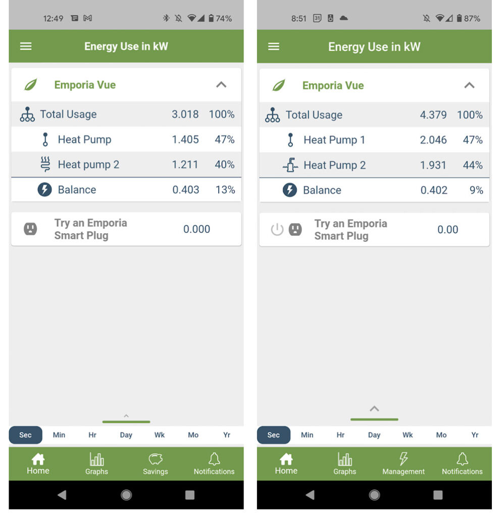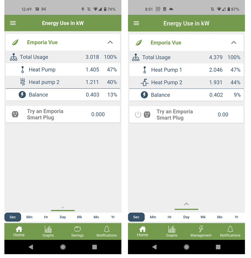 So I installed a system called the Emporia Energy Monitor into the circuit panel, which is currently the best value on the market for such a well-designed gadget. This allows me to track and record the full details of the energy flow – through every circuit in the house if I choose to do so. For now, I just have it watching over the heat pump.