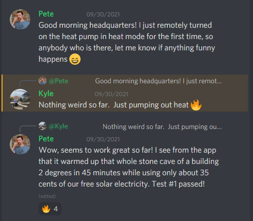 The next test will of course be the winter. Here in early October, we have just turned the corner where the building has required just a bit of heat to start some mornings. With a few taps on the Ecobee phone app, I was able to flip the system over to heating mode and give it a whirl. It worked great – heating the building quickly and quietly.
