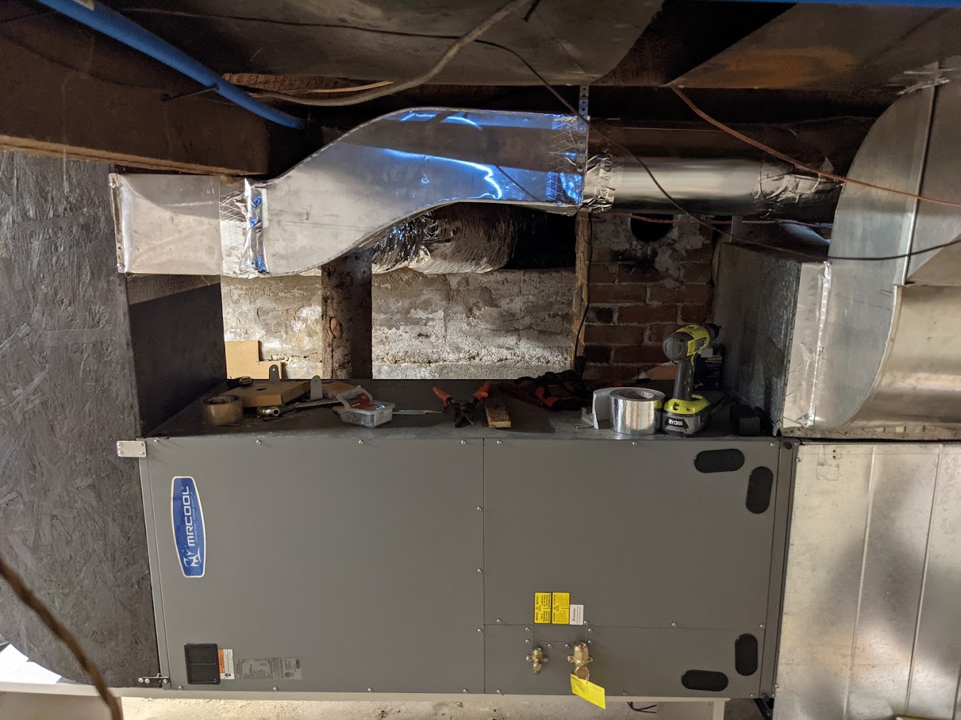 Aside from the fact that the thing is heavy (ours was around 250 pounds), this connection is surprisingly easy once you have the ducts ready. You just screw and seal the sheet metal boxes to the bottom and the top of the heat pump. And at this point, you should be getting excited because the end is in sight.