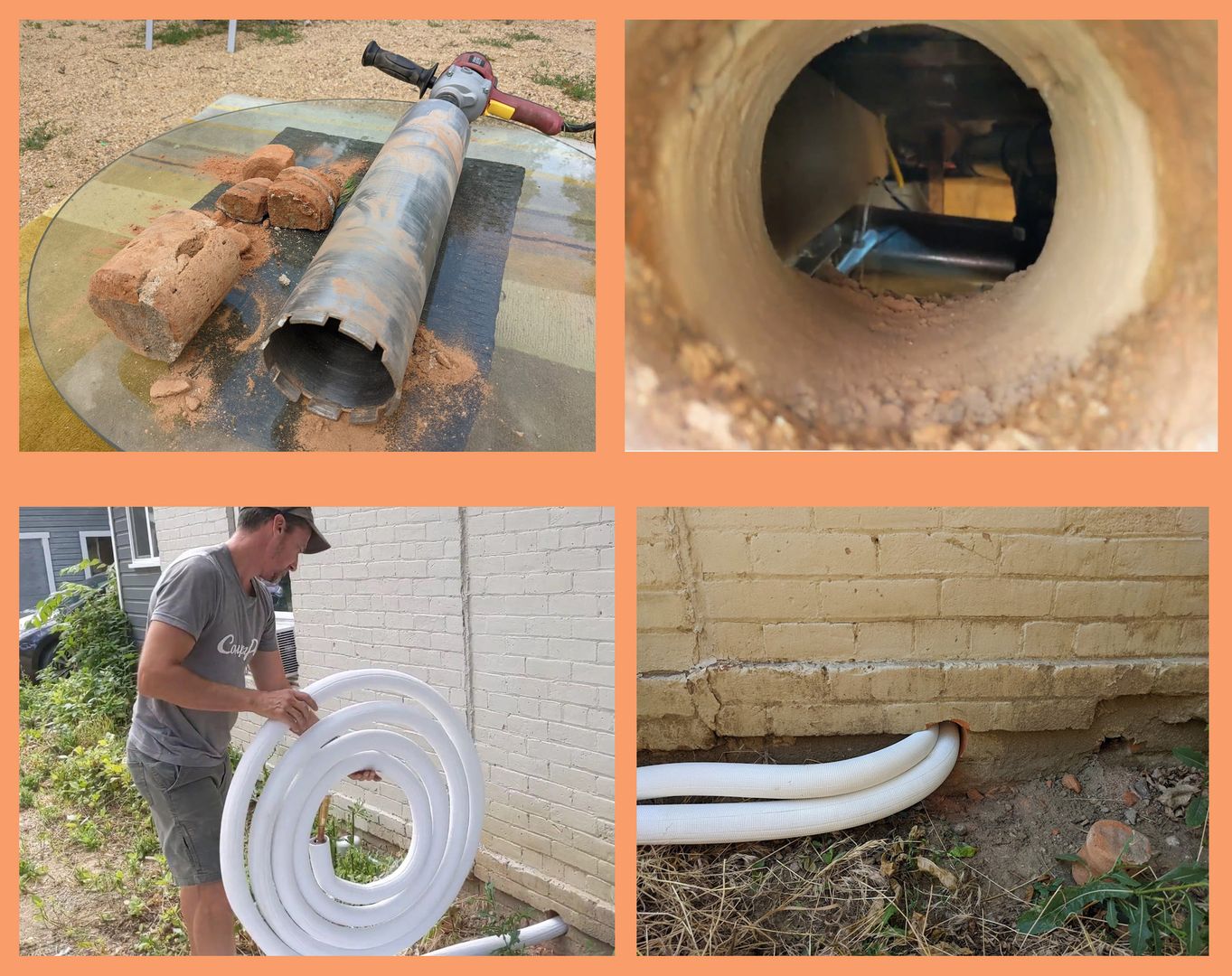 We had the added challenge of having to punch through an eight-inch-thick BRICK WALL, so I had to spend some good workout time wrestling with this massive concrete core driller, mounted to a high-torque low speed drill.