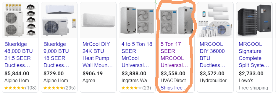 So I bought the circled option above. In my case, I placed the order through Home Depot website, with the free “ship to store” option, but you could also try your local Lowe’s, Alpine Home Air is good, and Ingrams now sells this unit (including the required 25 ft lineset) through Amazon.
